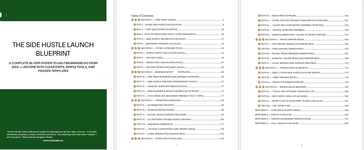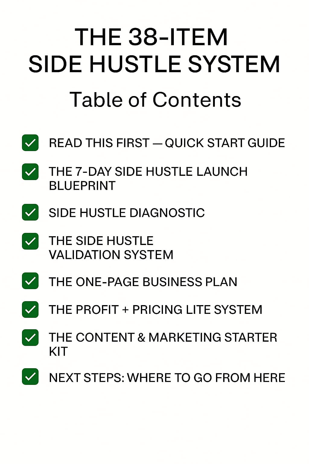 A complete digital system to help you choose, validate, and launch your first side hustle with confidence.